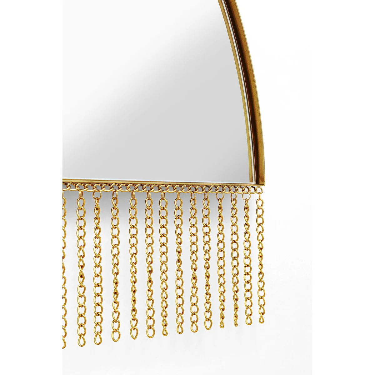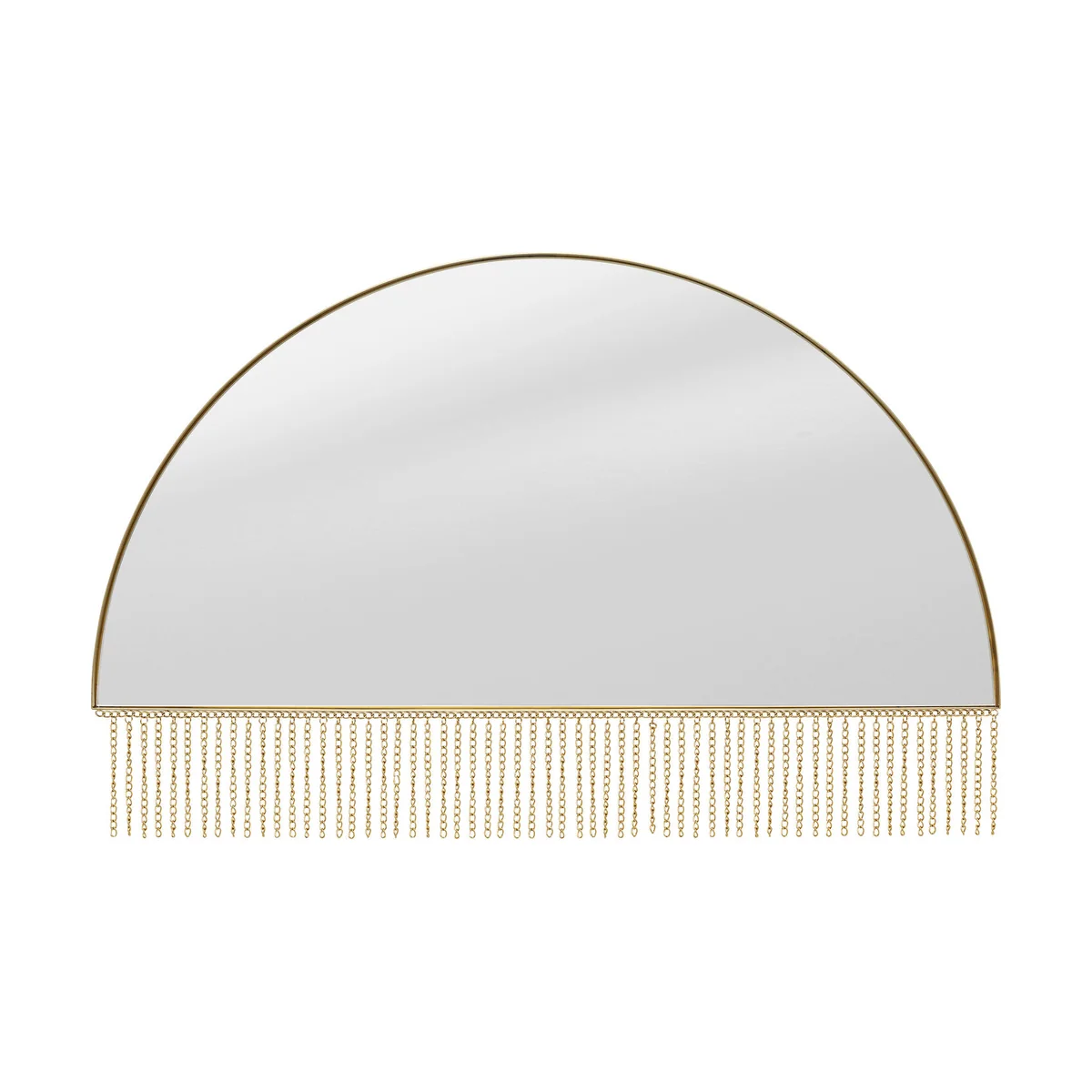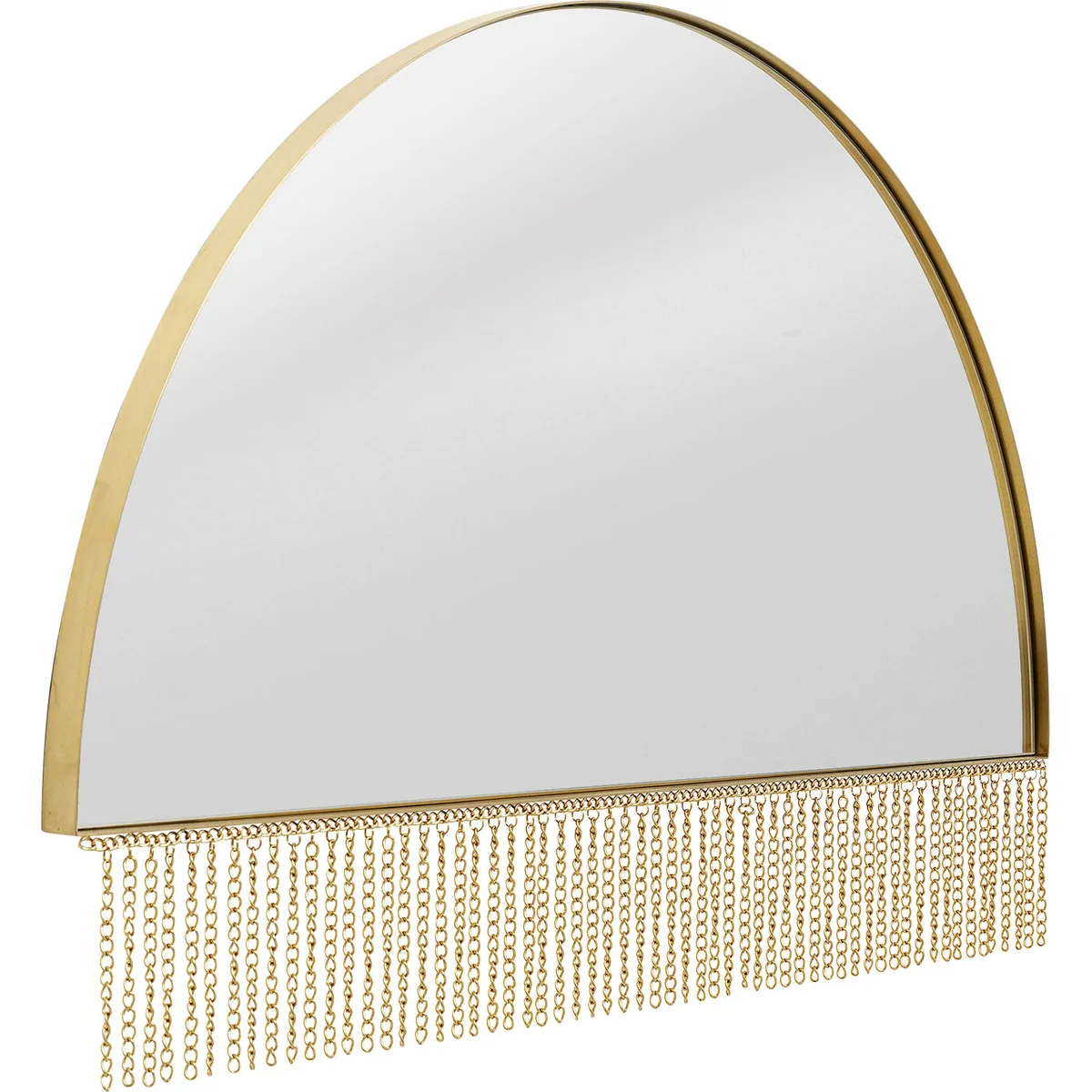 The Opera Half wall mirror is a striking and creative design piece for modern interiors. The semi-circular frame made of steel finished in brass and the golden metal chains give the mirror its individual aesthetic flair. Each piece is crafted by hand and therefore unique. The mirror has a reflecting surface of 109x69 cm and is mounted horizontally on the wall. This wall decoration will bring light into your living room, bedroom or hallway and is ornamentation that stylishly enhances any room. - Golden metal wall mirror, 110 x 70 x 3 cm (H/W/D) - A semi-circular mirror with fringes made of fine metal chains - The sturdy steel frame is coated with shimmering brass - Made by hand - A modern wall decoration with a glamorous, playful touch