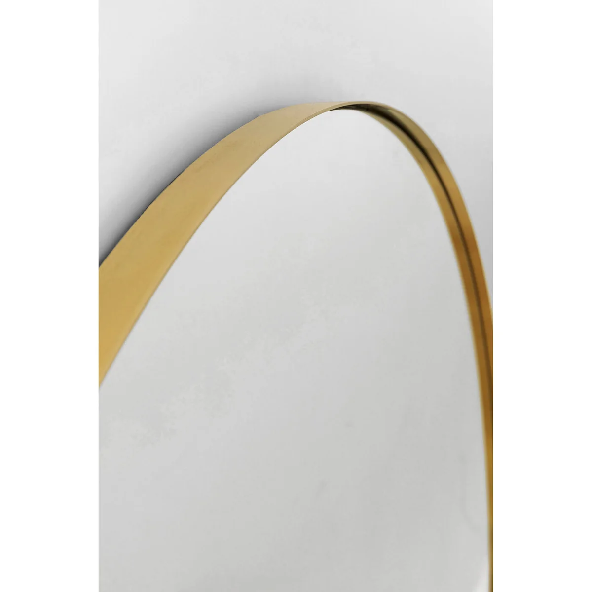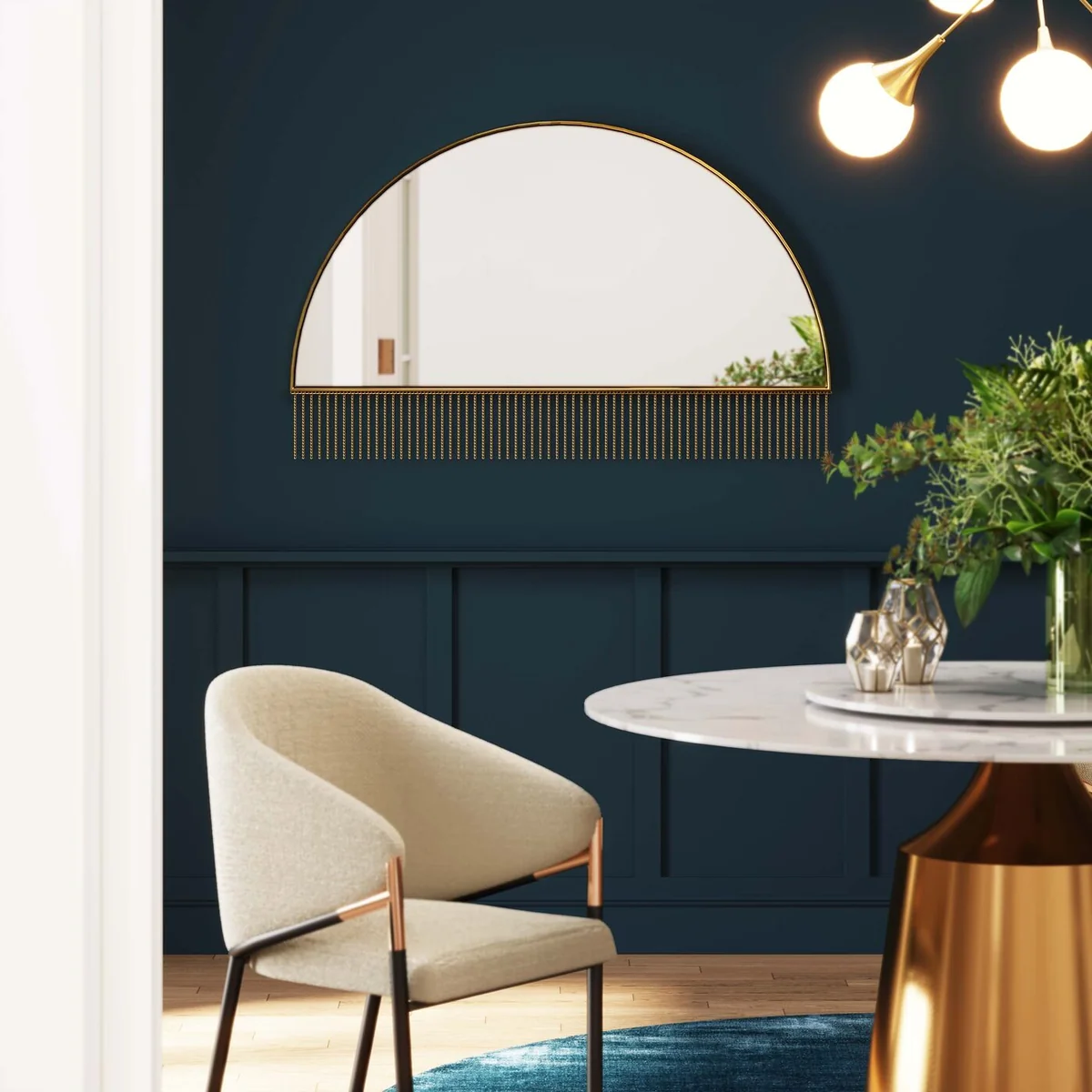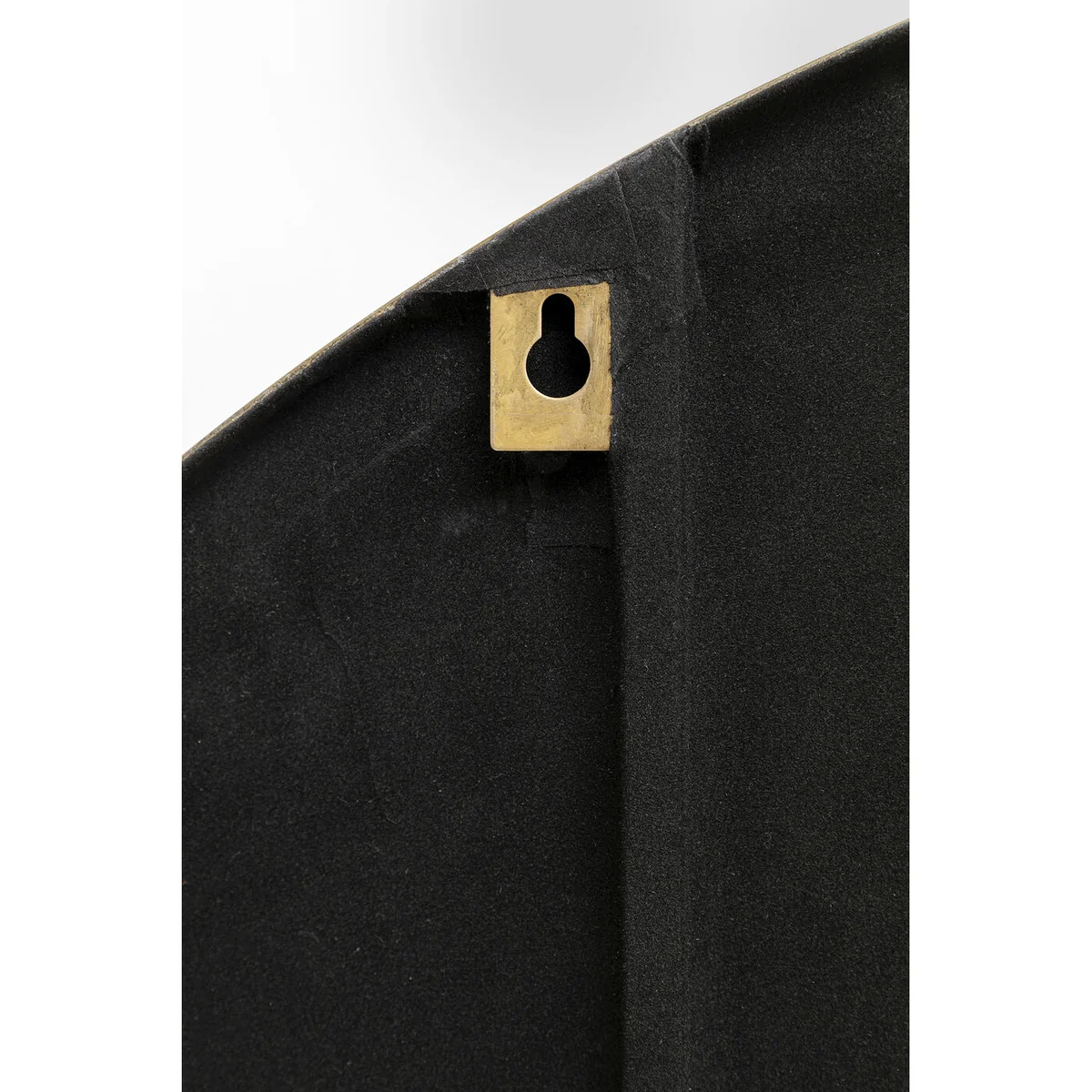 The Opera Half wall mirror is a striking and creative design piece for modern interiors. The semi-circular frame made of steel finished in brass and the golden metal chains give the mirror its individual aesthetic flair. Each piece is crafted by hand and therefore unique. The mirror has a reflecting surface of 109x69 cm and is mounted horizontally on the wall. This wall decoration will bring light into your living room, bedroom or hallway and is ornamentation that stylishly enhances any room. - Golden metal wall mirror, 110 x 70 x 3 cm (H/W/D) - A semi-circular mirror with fringes made of fine metal chains - The sturdy steel frame is coated with shimmering brass - Made by hand - A modern wall decoration with a glamorous, playful touch