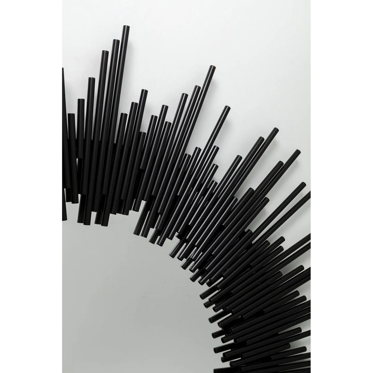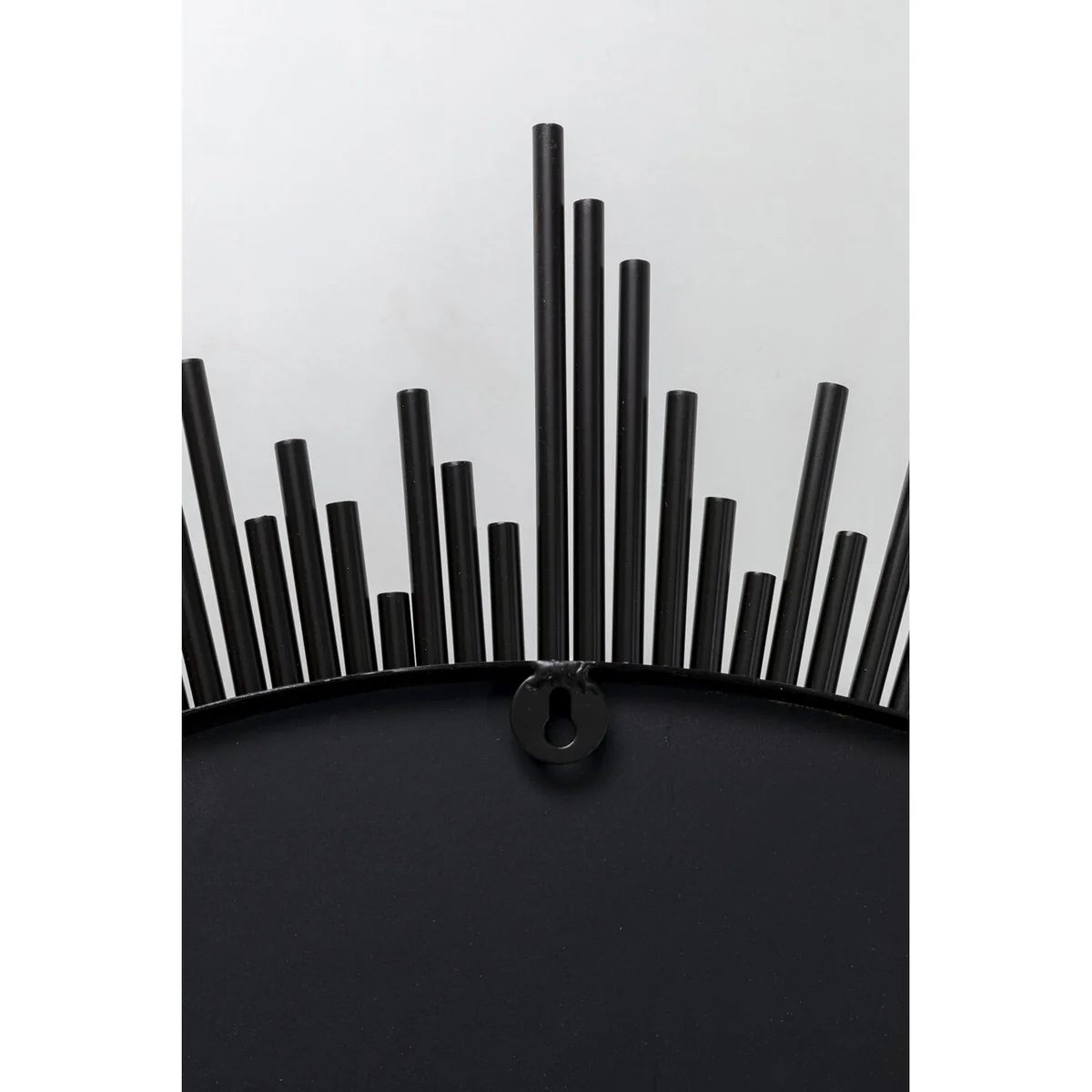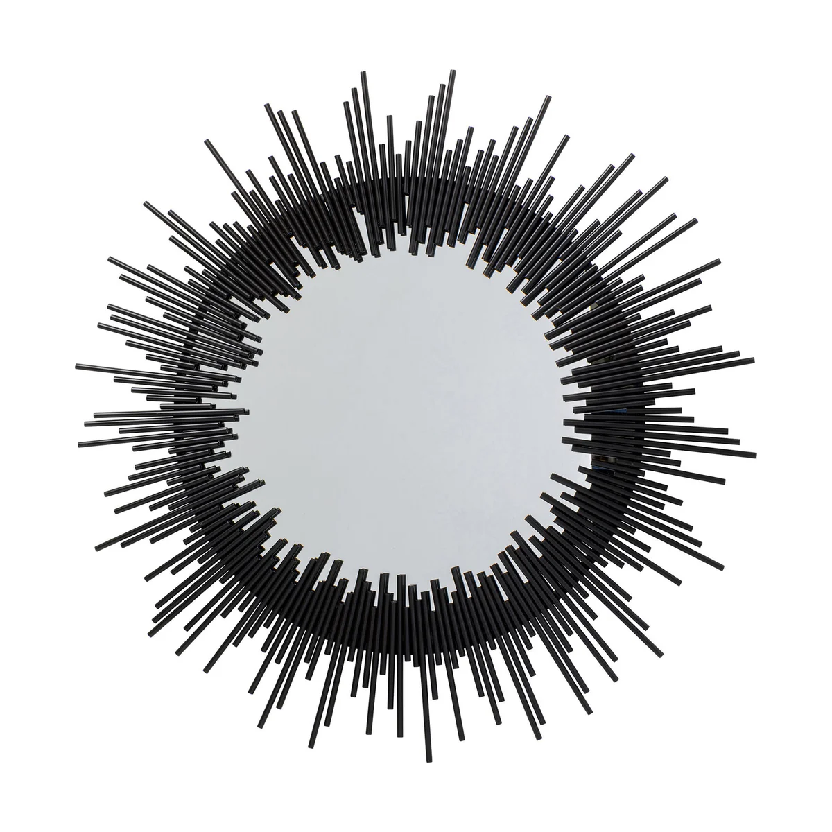Sun Rise Wall Mirror features a sleek black metal frame and a mirrored glass surface. Its round design complements various furniture shapes, adding balance and style to any room. Perfect for both modern and classic interiors.