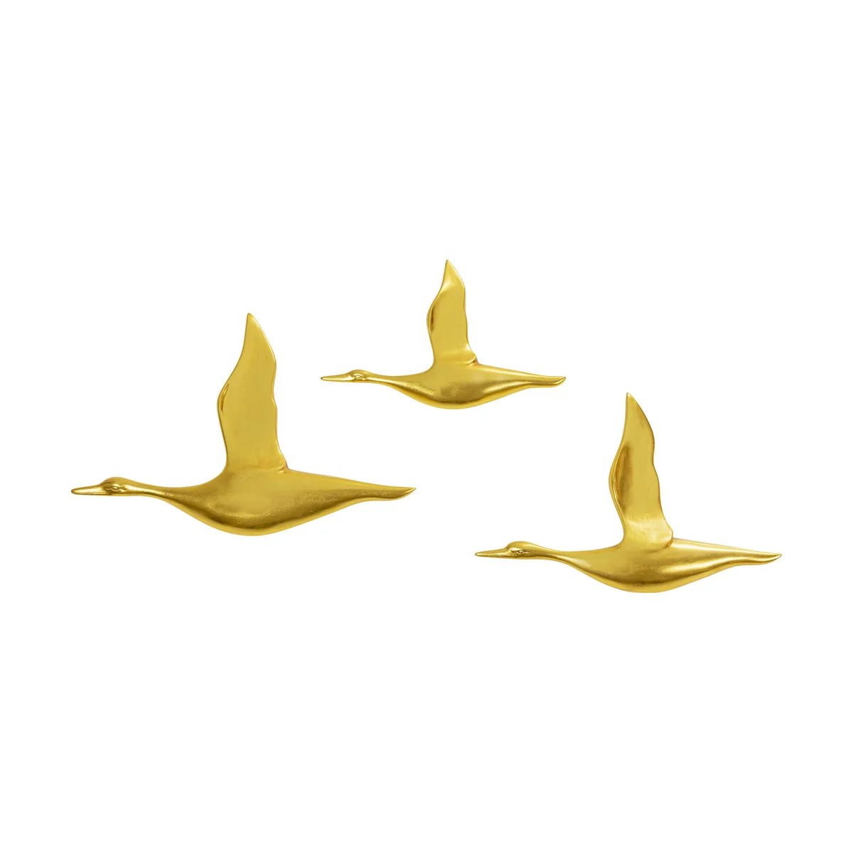 • A set of 3 gold-coloured ducks in flight to decorate your wall • Unique: handmade bird figures made of lacquered polyresin • Get creative and hang the ornamental birds on your walls just as you like • Each duck figure has recesses on the back for the hook on the wall