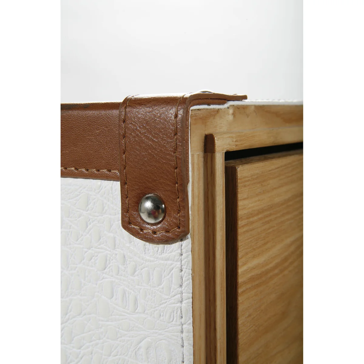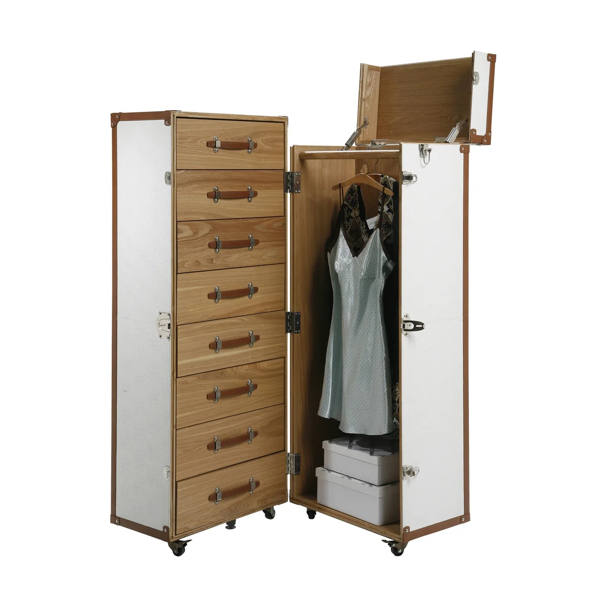 Trunk wardrobe: large luggage as aesthetic furniture. This stately looking piece is designed like an antique high society travel suitcase and completely assumes the function of a wardrobe. No one today travels with such large luggage, but the White Cosmopolitan wardrobe trunk has not lost its aesthetic appeal even in modern times. Eight drawers and a clothes rail offer nostalgic storage for all kinds of clothes. Order is created in a jiffy and the cupboard is closed, after which it decorates the room like an elegant piece of furniture.