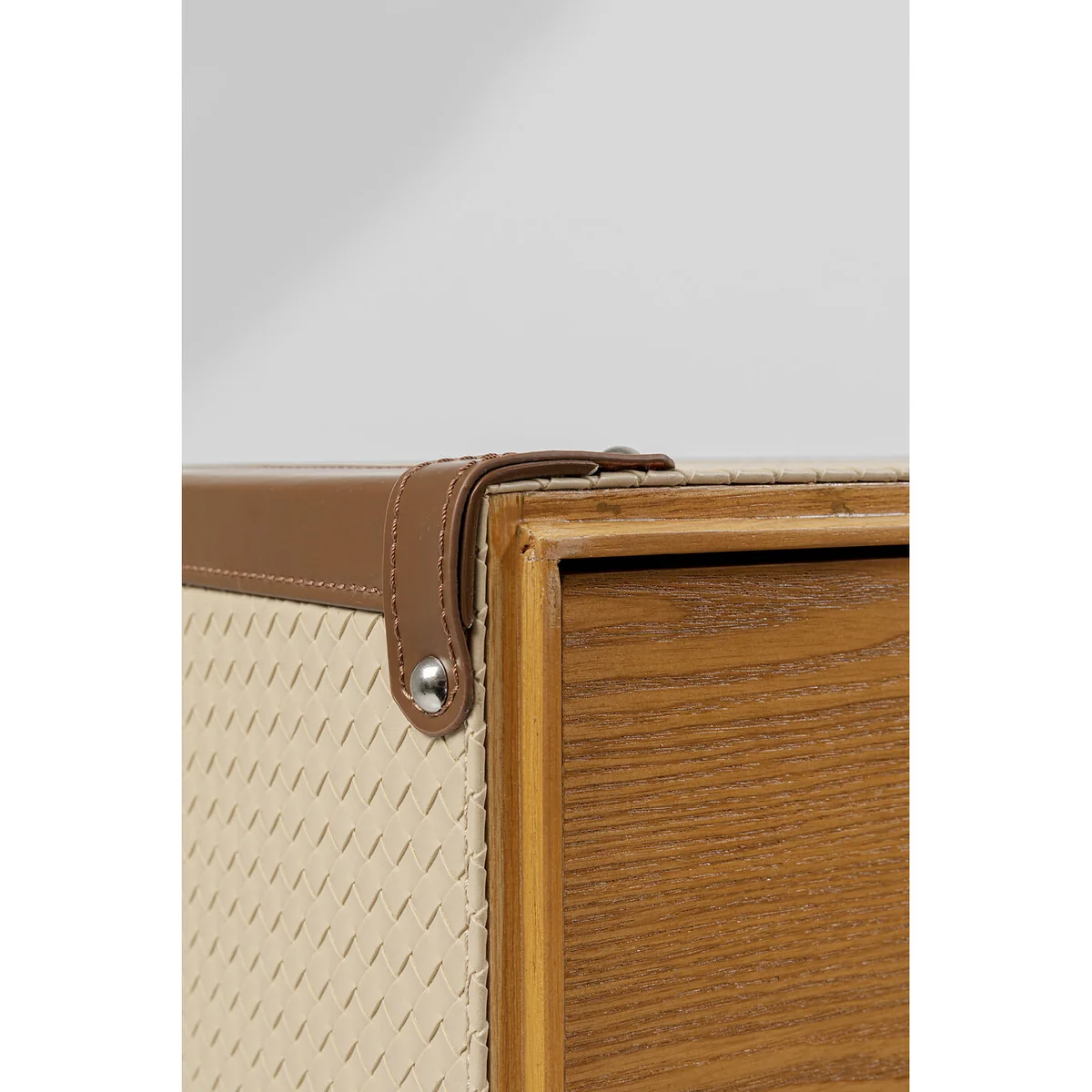 How can function, space-saving solutions and style be combined? With furniture in the look of cabin trunks on wheels, wearing an haute couture outfit! With the Venezia collection you will bring style and a love of travel into your living area. The surface of the trunk has an easy-care cover made of coated fabric in a classy wicker look. The creative design in the shape of a cabin trunk makes the wardrobe a real highlight. In the bedroom as a wardrobe, this creative piece of furniture offers generous space for clothes. It is also a great solution as a wardrobe in the hallway. Practical castors make it mobile and versatile. The wardrobe is a must-have for all those who want to combine modern design with functionality.