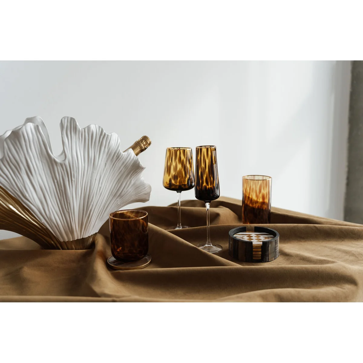 This unique water glass features a brown speckled pattern and a hand-painted gold rim, measuring 10 x 8.5 x 8.5 centimetres (H/W/D). With its generous capacity of 430 ml, it's perfect for serving refreshing drinks. The fine gold rim adds a subtle yet glamorous accent, enhancing its high-quality character.