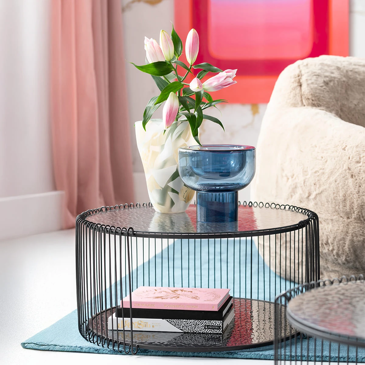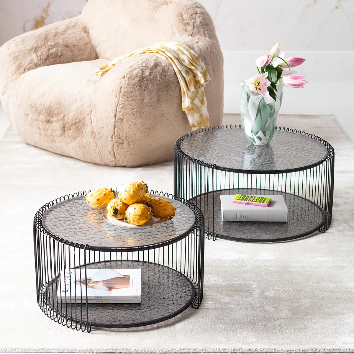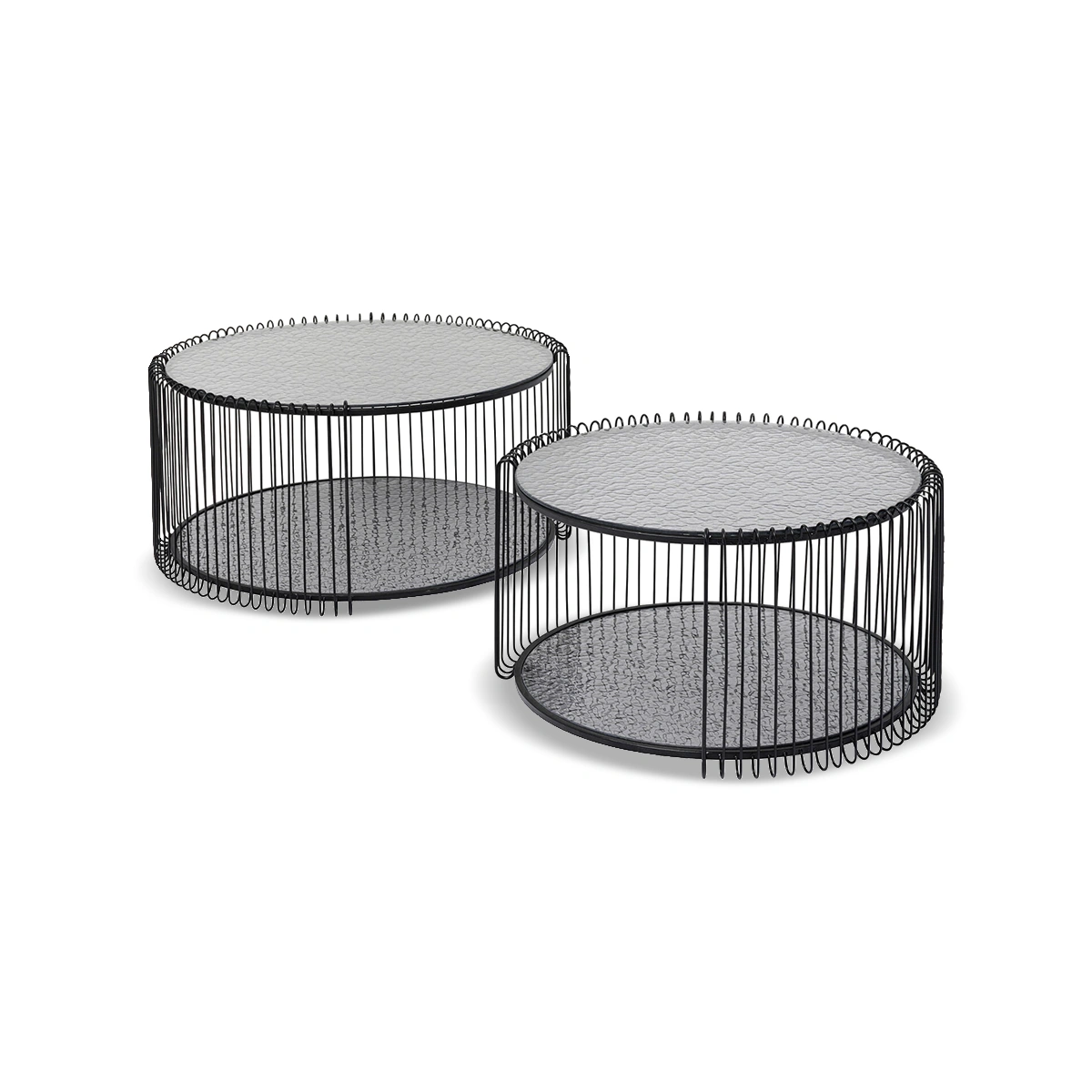 Experience the fusion of modern aesthetics and functionality with our Wire Double Bubble Coffee Tables Set in Black Steel and Glass. This set adds a contemporary edge to any living space with its compact, innovative design.