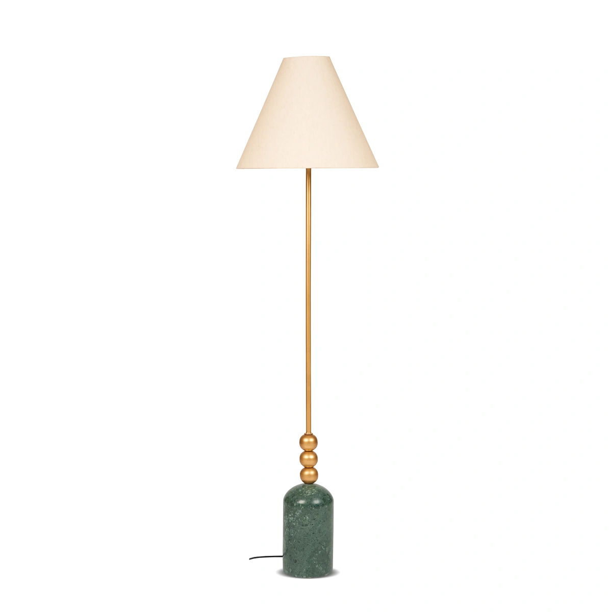 The lamp boasts a polished K Green Marble base, a durable Mild Steel frame with a Gold finish, and a soft diffuser crafted from Cotton Linen Fabric. With dimensions of L 40 cm, W 40 cm, and H 148 cm, it's ideally sized to add height and focus near a lounge chair or sofa.